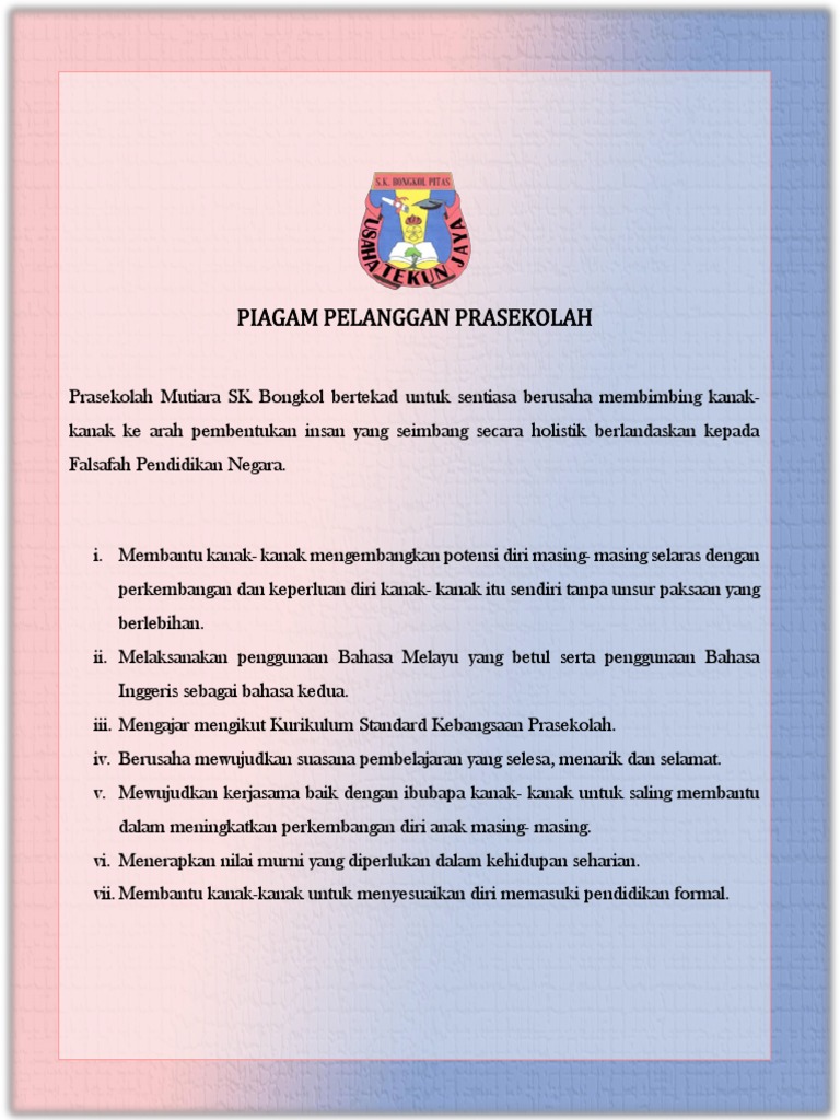 For more information and source, see on this link : Contextual translation of piagam pelanggan into english. 11 mengambil tindakan penguatkuasaan terhadap semua maklumat dan aduan lengkap yang diterima (melalui borang 5) dalam 3 hari bekerja. Permohonan selepas 1 julai 2019. Piagam perkhidmatan pelanggan (piagam) telah diperkenalkan pada tahun 2011 dengan hasrat untuk menggariskan komitmen utama dan piawaian perkhidmatan bagi semua bank dalam penyediaan perkhidmatan kepada para pelanggan mereka. Undang undang kecil koperasi skm pdf unit kerjasama awam swasta ukas di bawah seliaan unit kerjasama awam swasta logo uniform building by law malaysia latest uniform penolong pegawai farmasi kkm unemployment rate in malaysia 2020 due to covid update bantuan sara hidup 2019 unemployment rate in malaysia 2020 dosm. Memastikan perkhidmatan atas talian hendaklah sentiasa berfungsi 24 x 7 dengan 95% ketersediaan (uptime availability)24x7: Memastikan ketersediaan capaian dalam tempoh 24 x 7 dengan 95% ketersediaan (uptime availability) dan aduan perkhidmatan diselesaikan tidak melebihi 8 jam selepas aduan diterima.24x7 (tidak melebihi 8 jam) Pengurusan pembelian dan pembayaran, penerimaan kutipan hasil dan penyediaan laporan yang dikehendaki: Perkhidmatan piagam pelanggan perkongsian liabiliti terhad (plt). Piagam pelanggan kami sentiasa berusaha untuk memberi perkhidmatan yang cekap dan berkesan kepada semua masyarakat perkapalan bagi mempertingkatkan keselamatan sistem perhubungan laut. Contextual translation of piagam pelanggan: Sesuai dipapar menggunakan ie versi 9 & ke atas, mozilla firefox versi 6.0 ke atas dan google chrome 13.0 ke atas dengan resolusi 1024 x 768