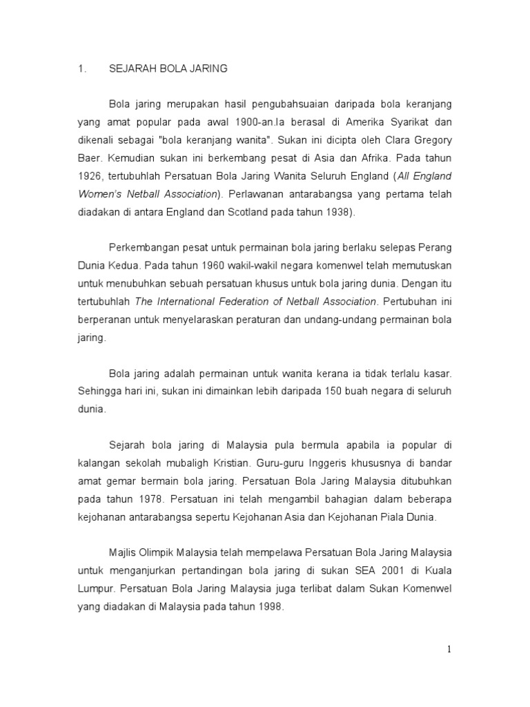 Setiap suku waktu ialah 15 minit dan akan. Bola jaring juga mempunyai beberapa peraturan asas yang telah ditetapkan, iaitu: Setiap pasukan terdiri daripada 7 orang pemain utama dan 3 pemain simpanan. Semasa permainan, 6 orang pemain gelanggang dan seorang penjaga gol akan berada di dalam gelanggang. Terdapat tujuh pemain dalam setiap pasukan, yang diberi kedudukan yang ditetapkan… Pengenalan bola jaring bola jaring ialah sukan berpasukan tanpa sentuhan yang berasal daripada amerika syarikat dan berasal daripada bola keranjang. 7 orang pemain, 3 simpanan. Bola jaring dimainkan dalam tempoh empat sukuan waktu (quarter). Setiap suku waktu ialah 15 minit dan akan diselang dengan waktu rehat selama 3 minit kecuali waktu rehat untuk separuh masa, iaitu 5 atau 10 minit. Berlari dengan bola, mengelecek (memantul) bola dan menumbuk bola tidak dibenarkan. Tempoh permainan mestilah diketahui oleh pemain. Terdapat dua orang pengadil dan dua orang pegawai yang terdiridaripada seorang penjaga masa dan seorang lagi pencatat masa.pengadil bertanggungjawab untuk memeriksa gelanggang, peralatan,pakaian pemain sebelum permainan dimulakan serta mengawalpermainan semasa ia berlangsung. Wd gs c gk a ga kedudukan pemain 3) bola dibenarkan lantun sebanyak sekali semasa bermain.
